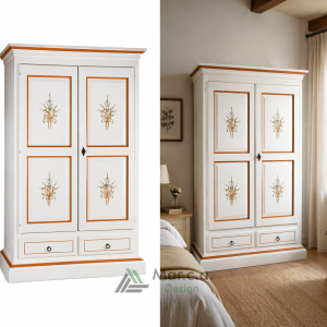 Armadio con 2 Porte e Cappello a Gendarme Tondo, 2 Cassetti in Legno di Pioppo Bianco Decorato, Mobile da Interno Arte Povera Made in Italy – Misura 125x61x200h (503)