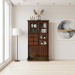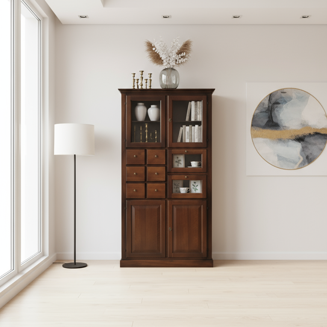 Vetrina Soggiorno Elegante in Legno di Pioppo, Cristalliera Color Noce Scuro con 3 Ante e 3 Cassetti – Mobile Soggiorno, Arte Povera Made in Italy – Mis. 156x42x205h (381)
