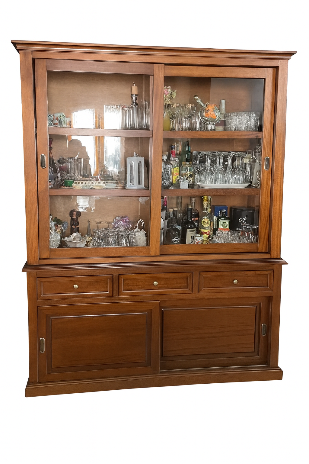 Credenza vetrina in legno di pioppo con 2 ante scorrevoli, 3 cassetti e finiture curate.