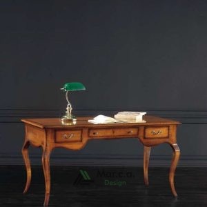 Scrivania dotata di 5 cassetti in legno, gambe in massello di faggio, cassetti in massello di pioppo, bordo piano in massello di pioppo, struttura impiallacciata in pioppo.