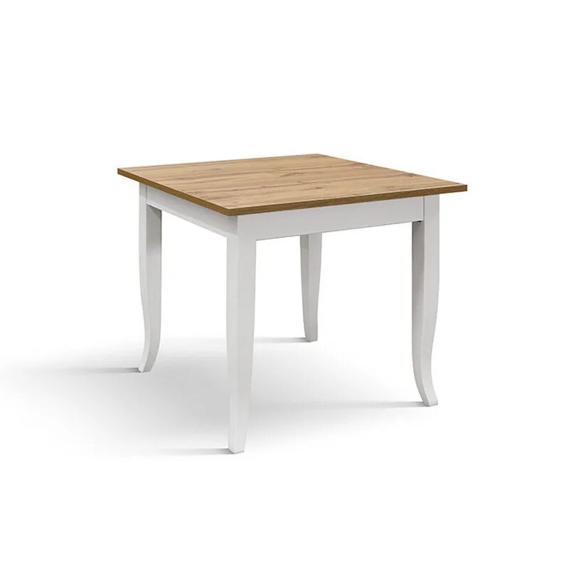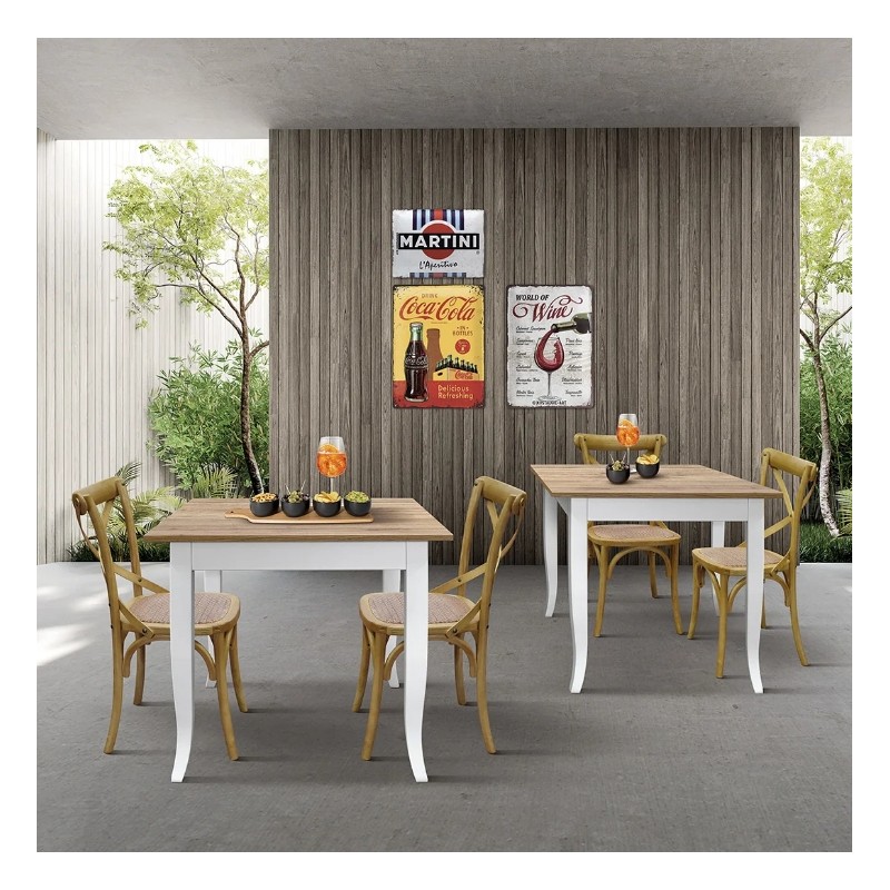 Tavolo quadrato 80×80 cm con piano in legno nobilitato finitura rovere rustico e struttura in legno massello bianco. Robusto, elegante e perfetto per cucine, soggiorni, taverne e ambienti in stile moderno o country.
