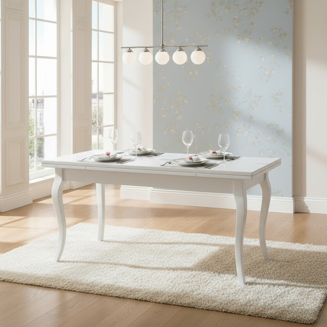 Tavolo Classico Allungabile fino a 160 cm, Gambe a Sciabola, Legno di Pioppo Bianco Opaco, Allunghe Laterali – Tavolo Arte Povera, Mis.160×85 chiuso e 240x85x78h aperto (1000)